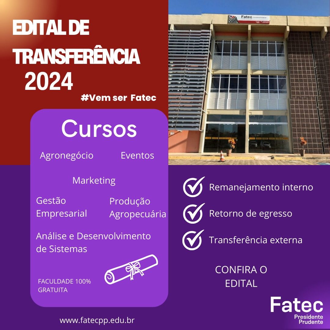 A Diretora da Faculdade de Tecnologia de Presidente Prudente torna público o Edital nº 12/2024, contendo normas, rotinas e procedimentos que orientam o REMANEJAMENTO INTERNO (de turno para alunos internos), RETORNO DE EGRESSO e/ou TRANSFERÊNCIA EXTERNA para ocupação de vagas remanescentes para o 2º SEMESTRE DE 2024 nos Cursos Superiores de Tecnologia.
