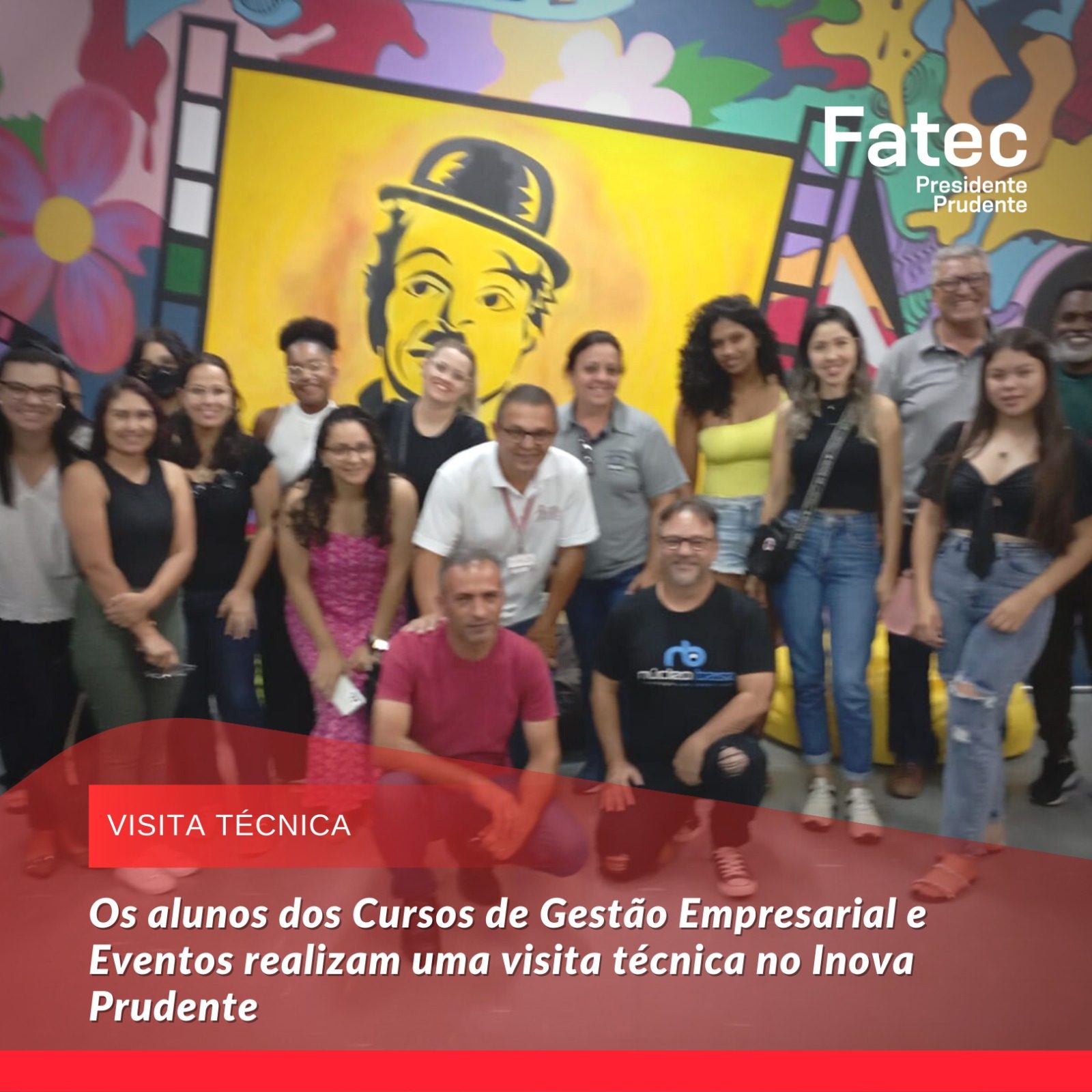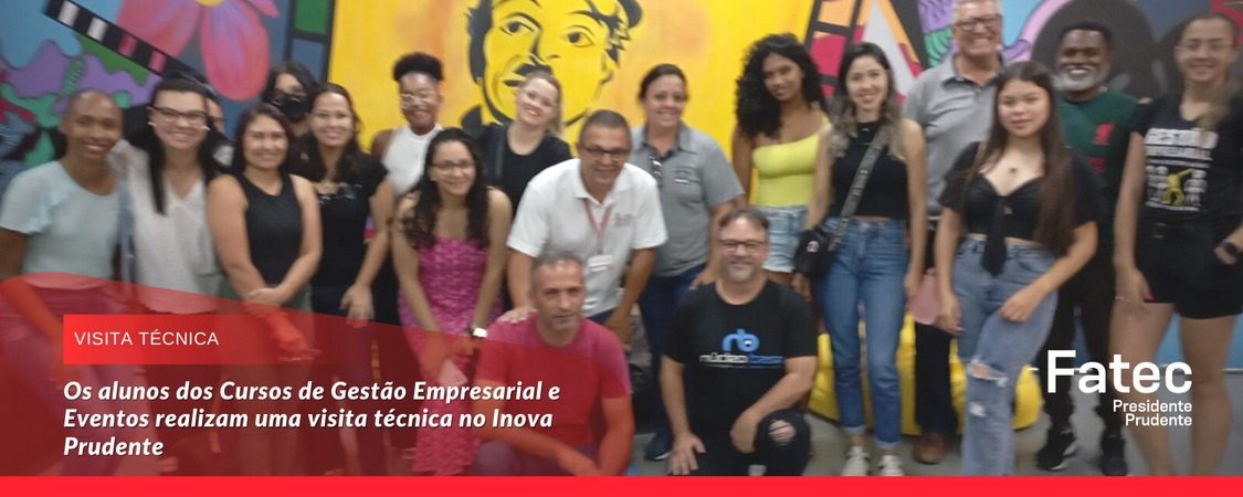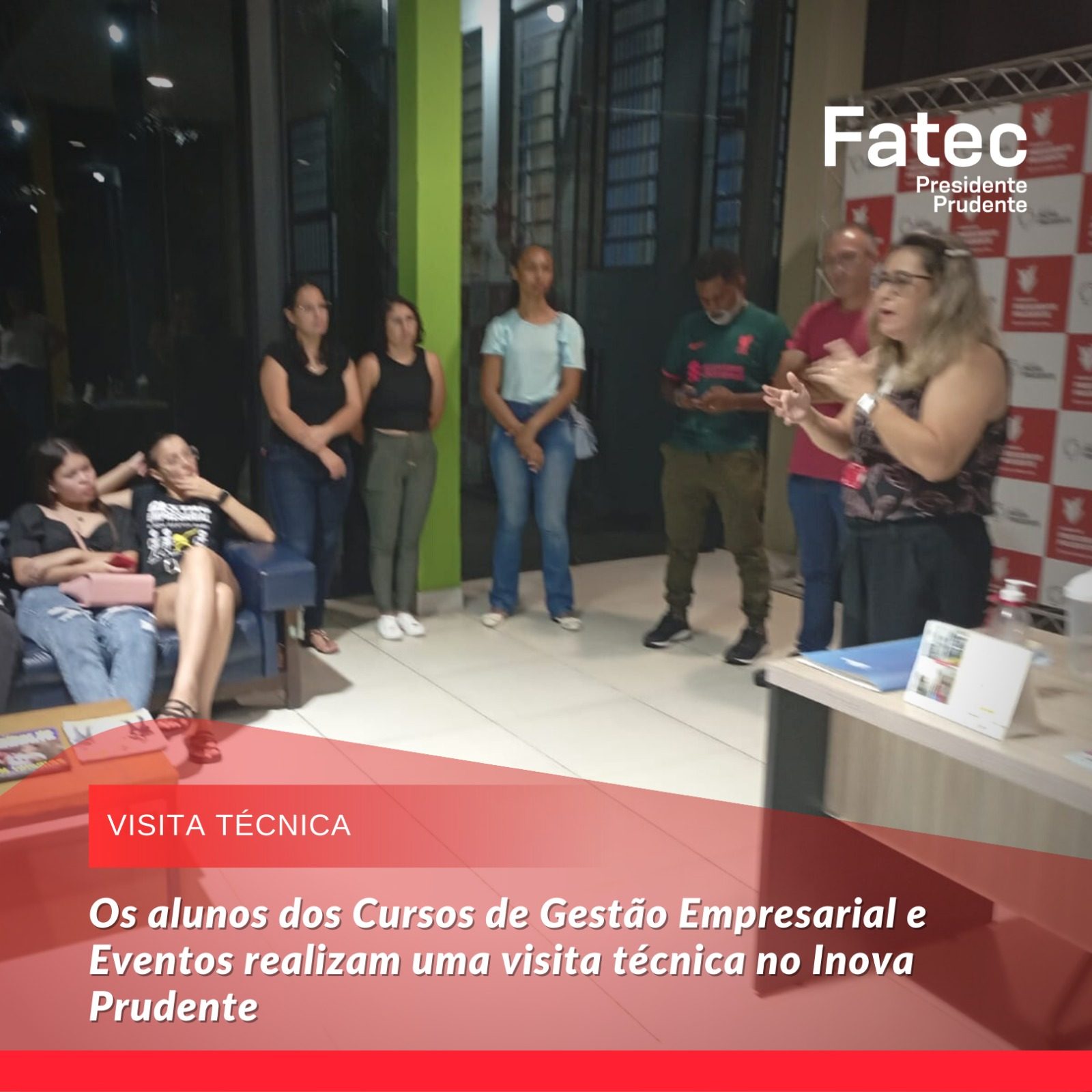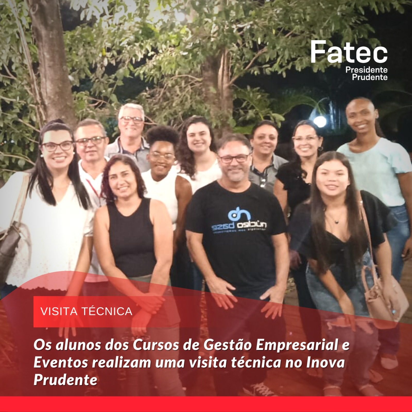 O docente da Fatec Prudente, Prof. Me. Edson Roberto Manfre, juntamente com os alunos 4º módulos dos Cursos de Eventos e Gestão Empresarial, realizaram uma visita técnica no dia 23 de março. Na ocasião, eles conheceram a Empresa Inova Prudente.