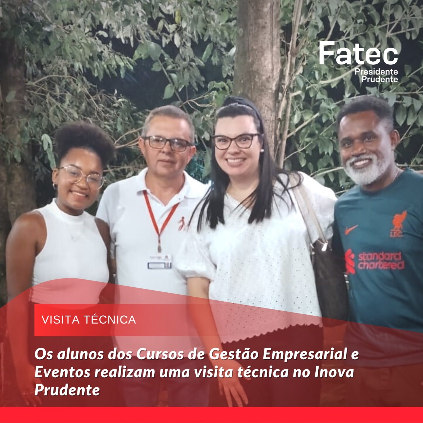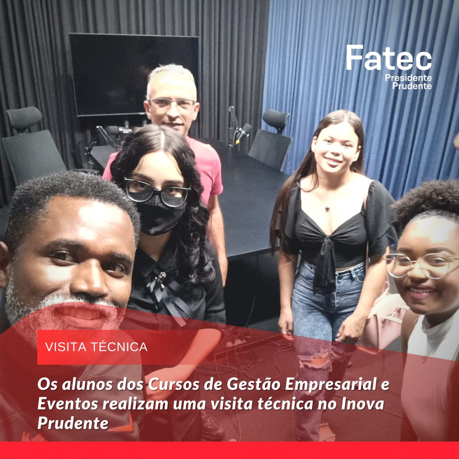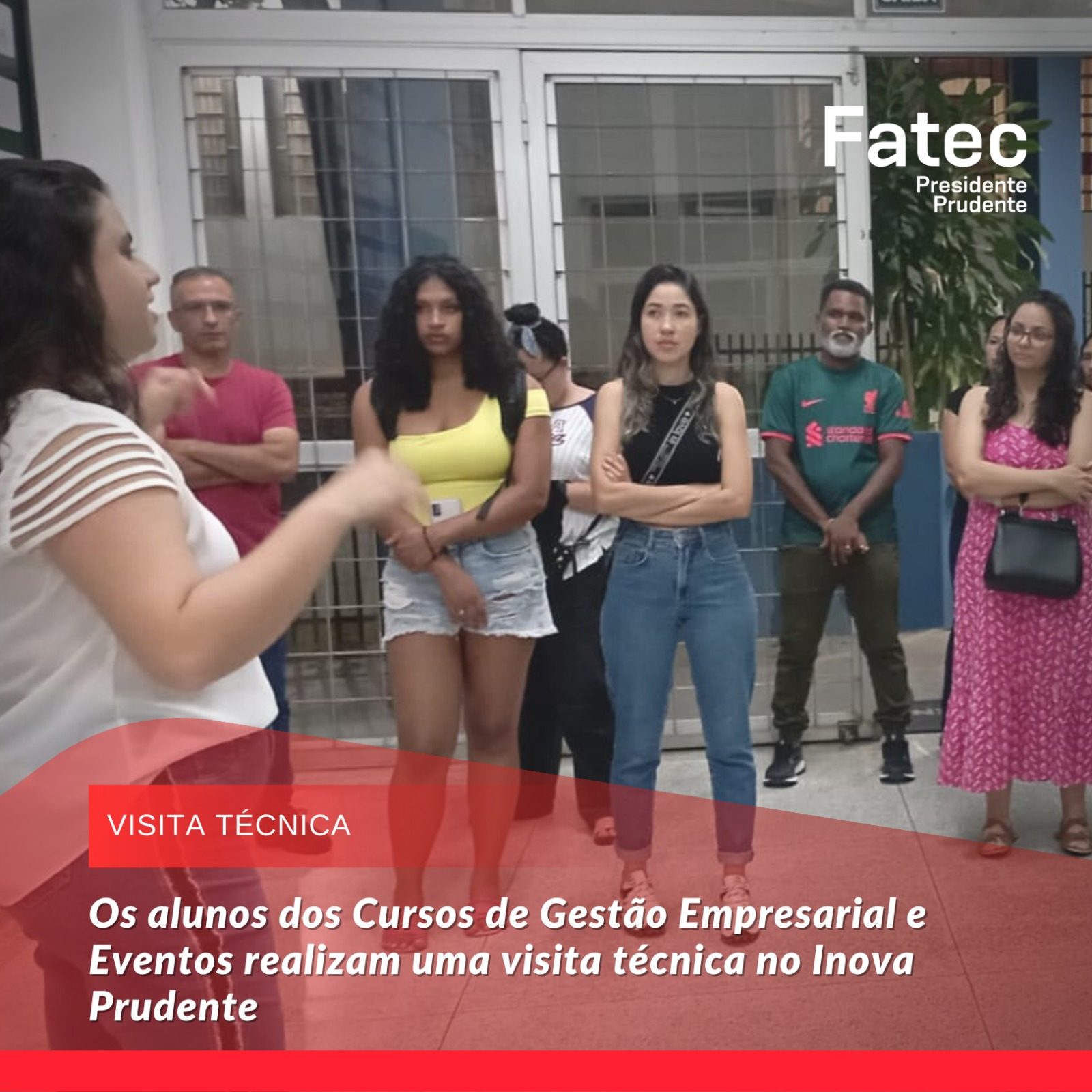 O docente da Fatec Prudente, Prof. Me. Edson Roberto Manfre, juntamente com os alunos 4º módulos dos Cursos de Eventos e Gestão Empresarial, realizaram uma visita técnica no dia 23 de março. Na ocasião, eles conheceram a Empresa Inova Prudente.