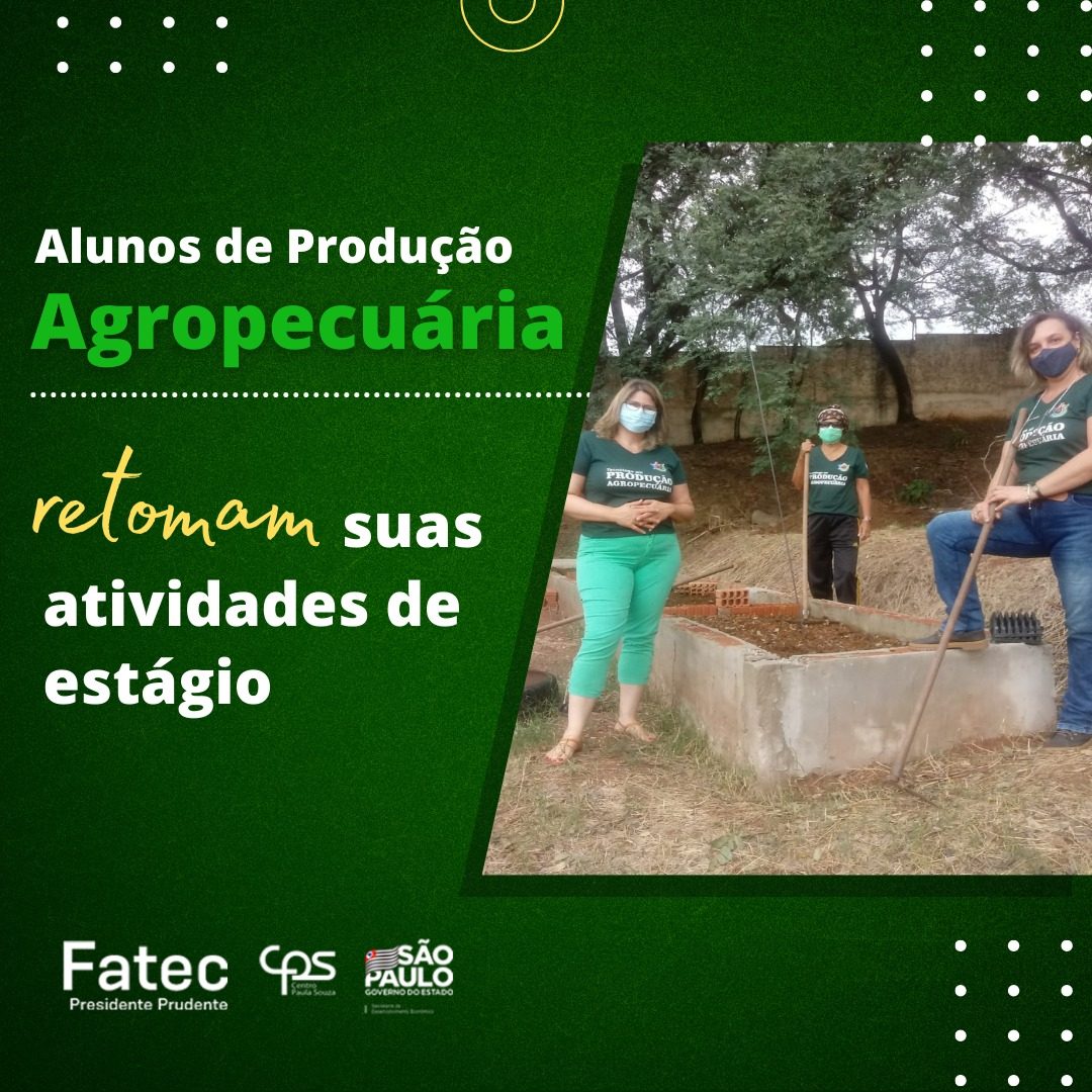 Segundo a coordenadora do curso Superior de Tecnologia em Produção Agropecuária, Profa. Dra. Angela Madalema M. Godinho, conforme as empresas vão retomando, os estagiários também retornam. No início deste mês os alunos do 5º e 6º módulo do curso de Produção Agropecuária retornaram suas atividades seguindo os protocolos de segurança na própria Instituição e também na Escola Técnica Estadual Prof. Dr. Antonio Eufrásio de Toledo, em Presidente Prudente.