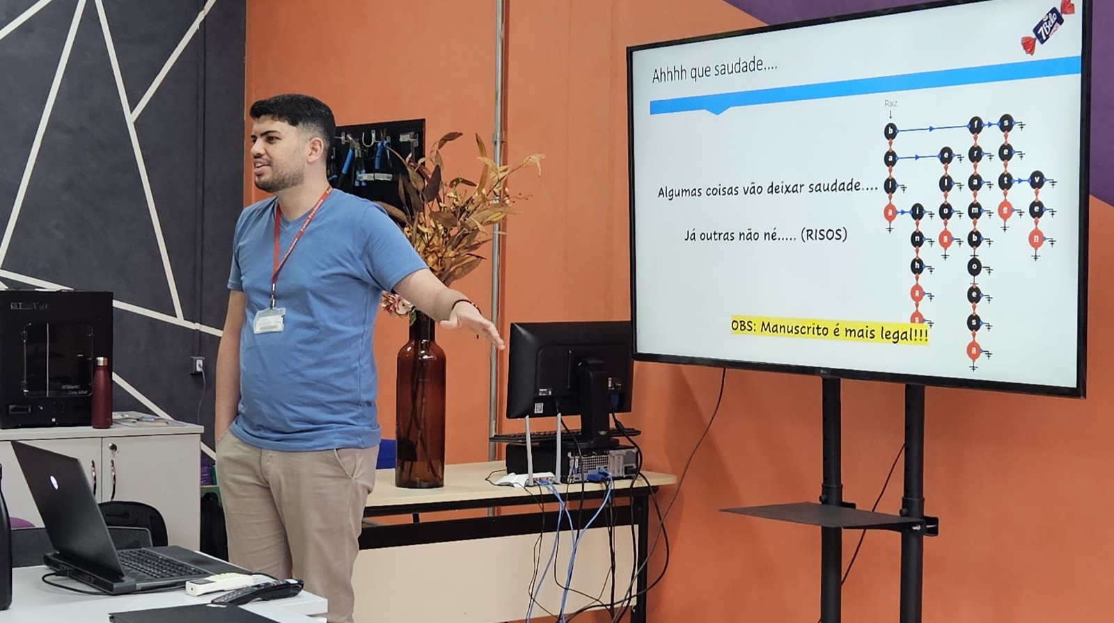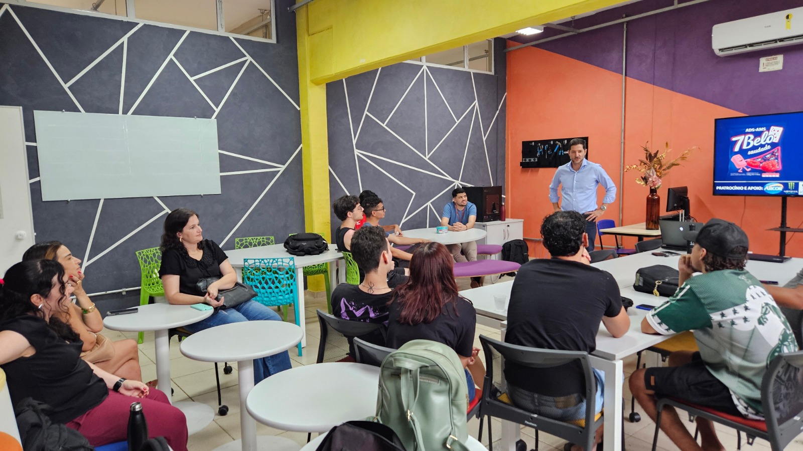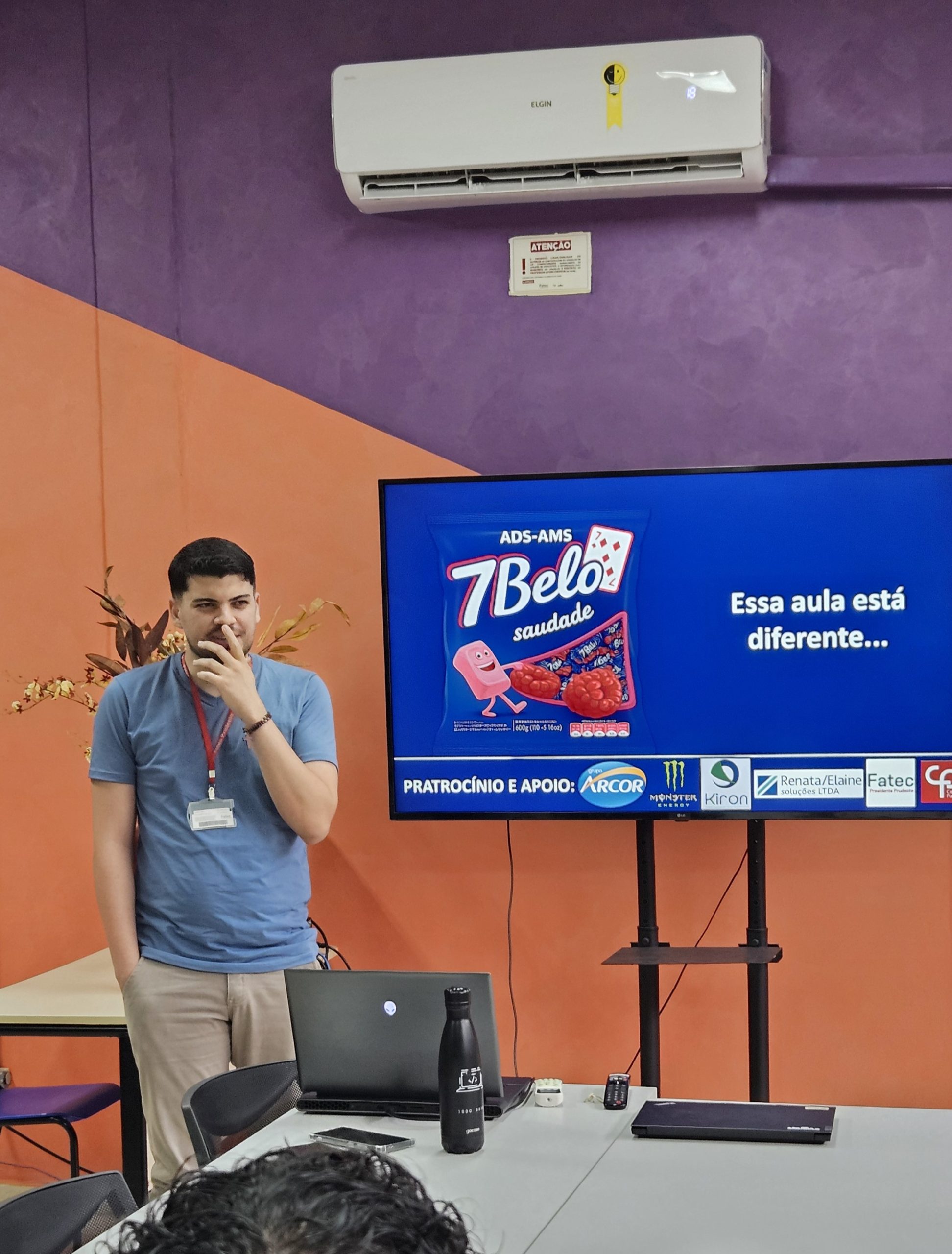 Em seguida, o Prof. Me. Bruno Santos de Lima, escolhido como paraninfo da turma, conduziu uma aula diferente, relembrando momentos marcantes vividos ao longo dos dois anos de curso. Em sua fala, evidenciou o amadurecimento técnico e pessoal dos alunos, ressaltou o perfil diferenciado da turma e compartilhou orientações para os próximos passos da vida profissional.