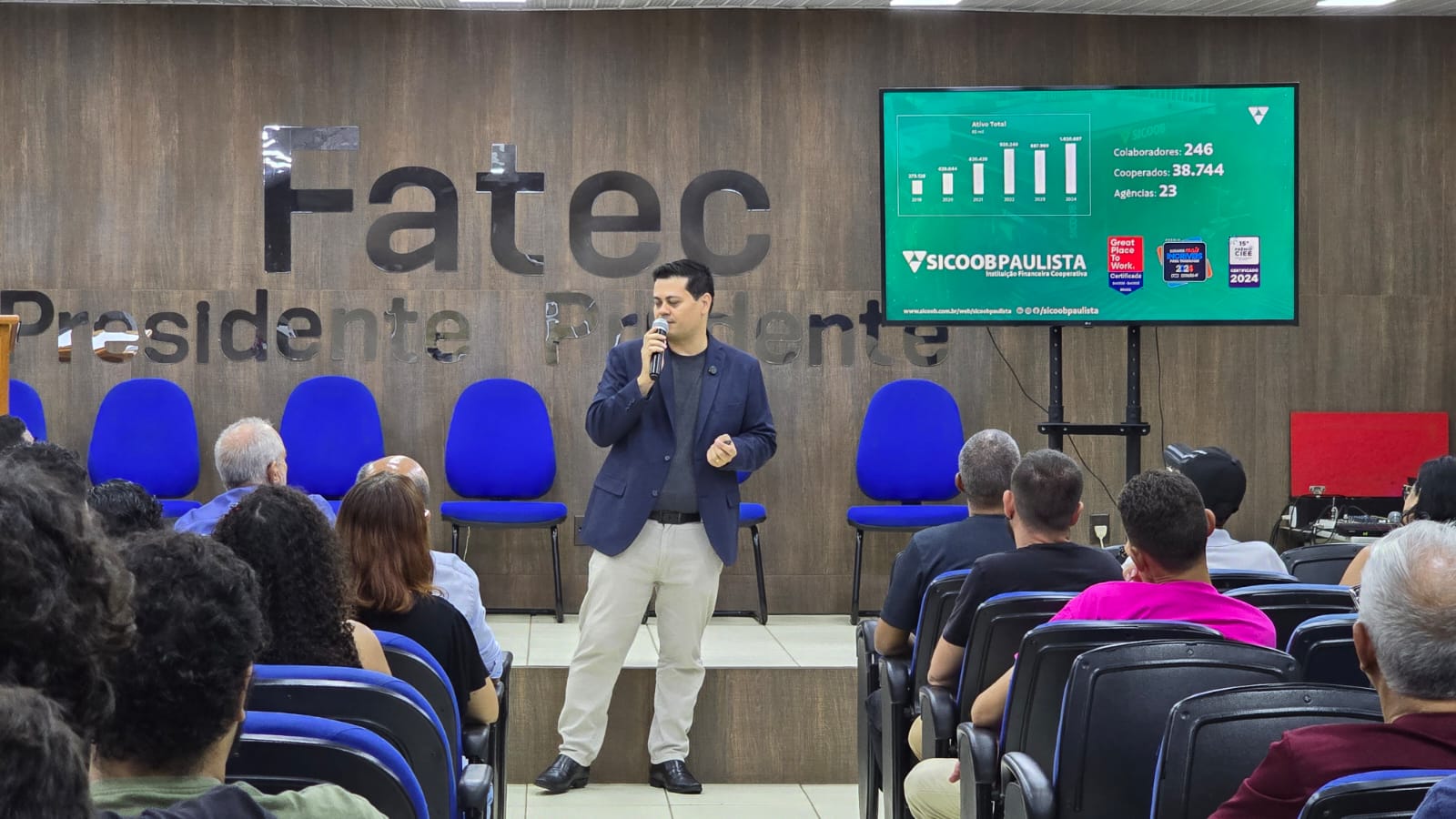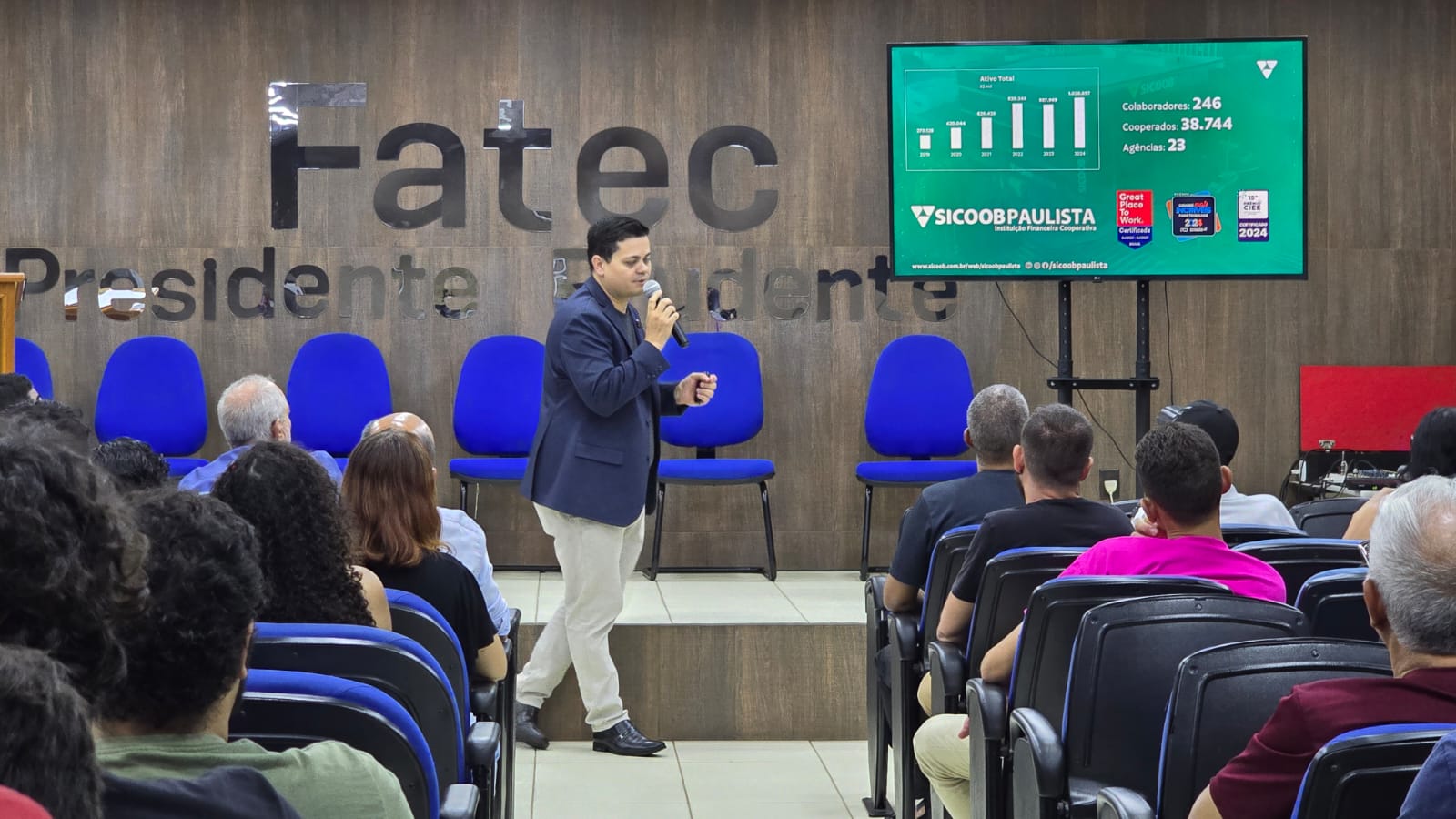 A Aula Magna teve a honra de receber o CEO do Sicoob Paulista, Sr. Sergio Nascimento, que ministrou a palestra “De Estagiário a CEO”. O Sr. Nascimento compartilhou sua trajetória profissional, desde os primeiros passos como estagiário até o cargo de CEO, inspirando os alunos a perseguirem seus sonhos e acreditarem em seu potencial.