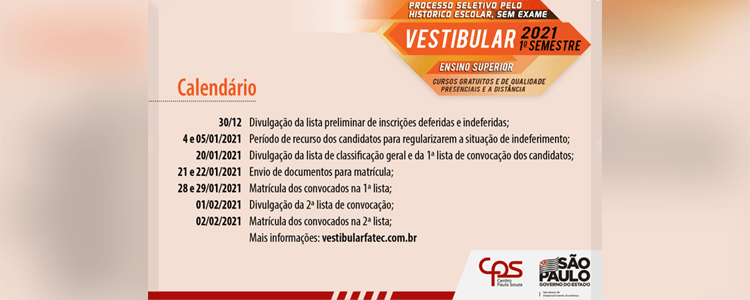 Confira na íntegra as datas referentes ao Vestibular das Fatecs para o 1º semestre de 2021!
