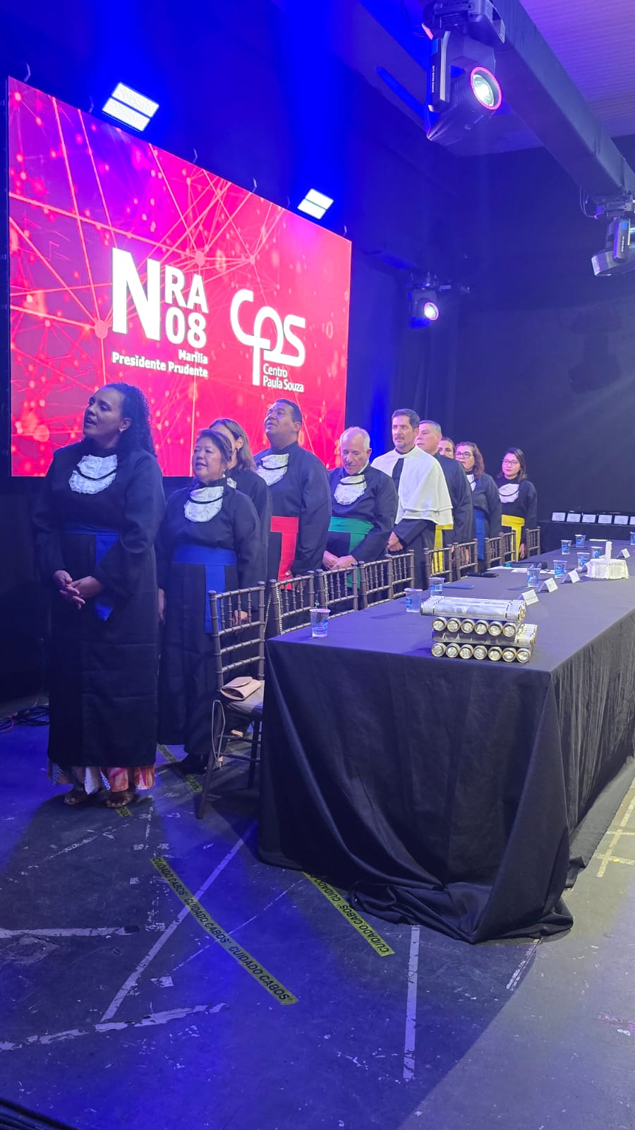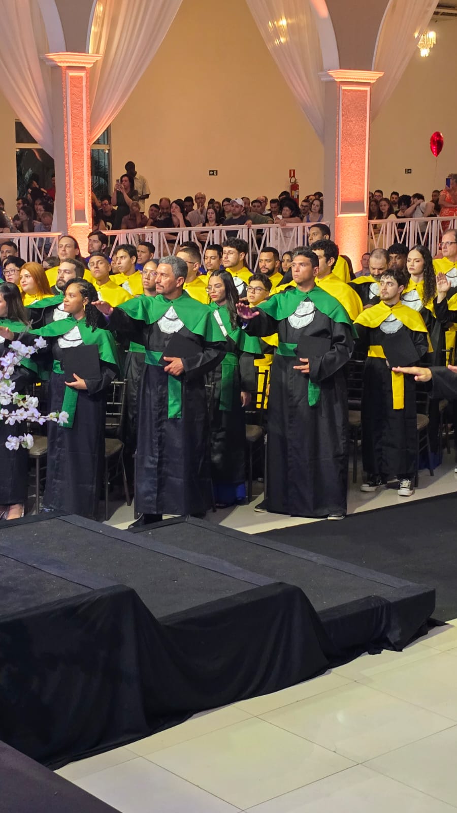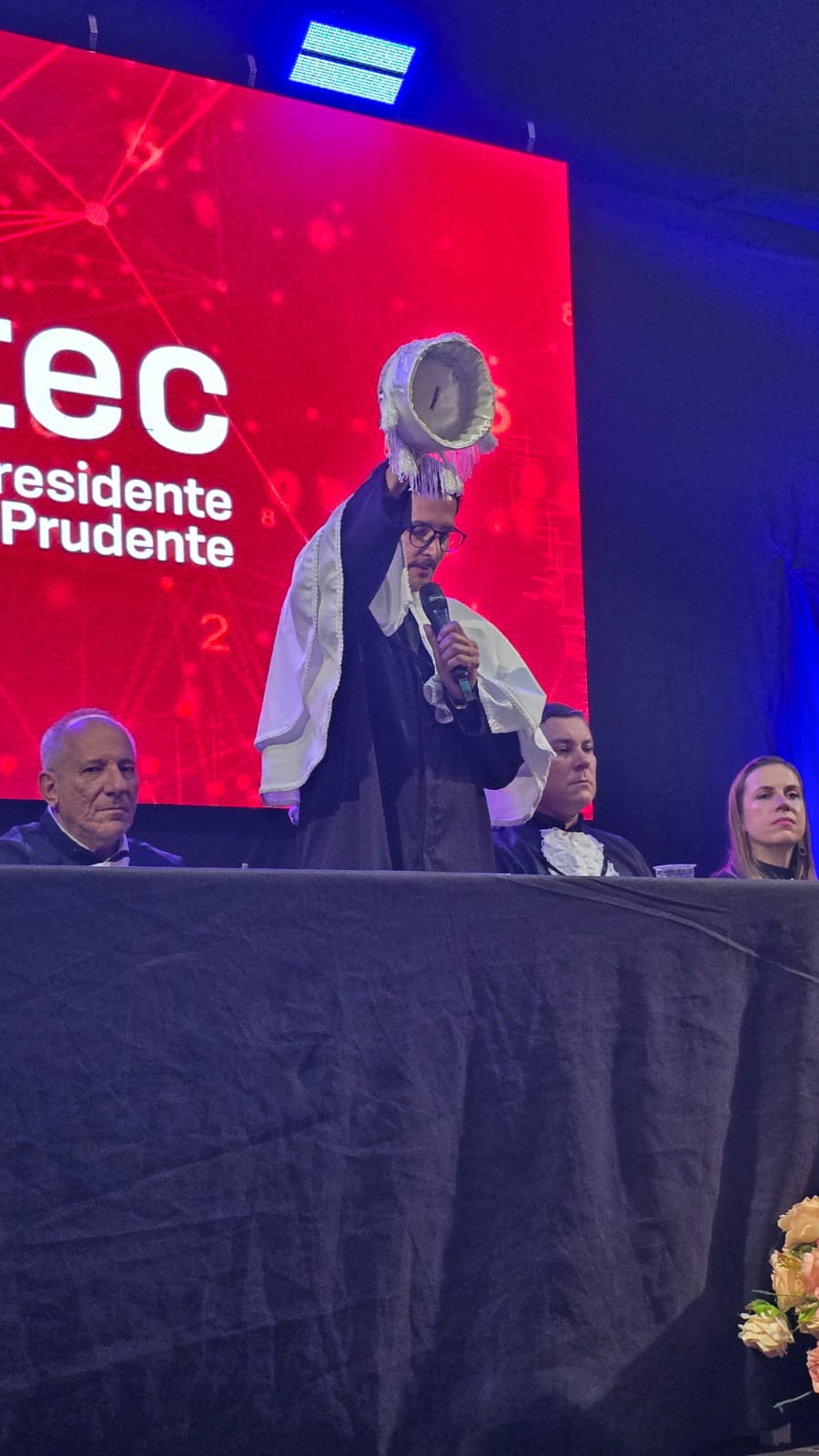 A mesa diretiva da cerimônia foi presidida pelo Coordenador da unidade, Prof. Dr. Ari Alves de Oliveira Filho, acompanhado pelos coordenadores dos cursos: Prof. Esp. Sidnei Favarin (Agronegócio); Prof. Me. Rodrigo Vilela da Rocha (Análise e Desenvolvimento de Sistemas); Profa. Dra. Edilene Mayumi Murashita Takenaka (Marketing); Profa. Dra. Juliana Casarotti Ferreira dos Santos (Gestão Empresarial – presencial); Prof. Me. William Henoch Alves Pereira (Gestão de Eventos); Profa. Dra. Silmara Ribeiro Moscatelli (Gestão Empresarial – EaD e orientadora de polo); Profa. Dra. Angela Madalena Machizelli Godinho (Produção Agropecuária); Profa. Dra. Renata Nagima Imada (Análise e Desenvolvimento de Sistemas – AMS) e Profa. Ma. Jacqueline Pereira dos Santos Souza (Processos Gerenciais – AMS).