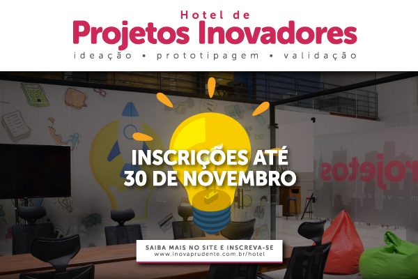 Você estudante acadêmico, empreendedor ou pesquisador, que busca validar sua ideia ou projeto afim de transformá-lo em um negócio, agora tem a oportunidade de fazer parte do Hotel de Projetos Inovadores da Inova Prudente. As inscrições, que seriam até segunda-feira (16), foram prorrogadas até o dia 30 de novembro para dar mais chances a futuros participantes que estavam tendo dificuldades em conseguir finalizar o projeto e obter a carta de recomendação que garante um diferencial na avaliação.