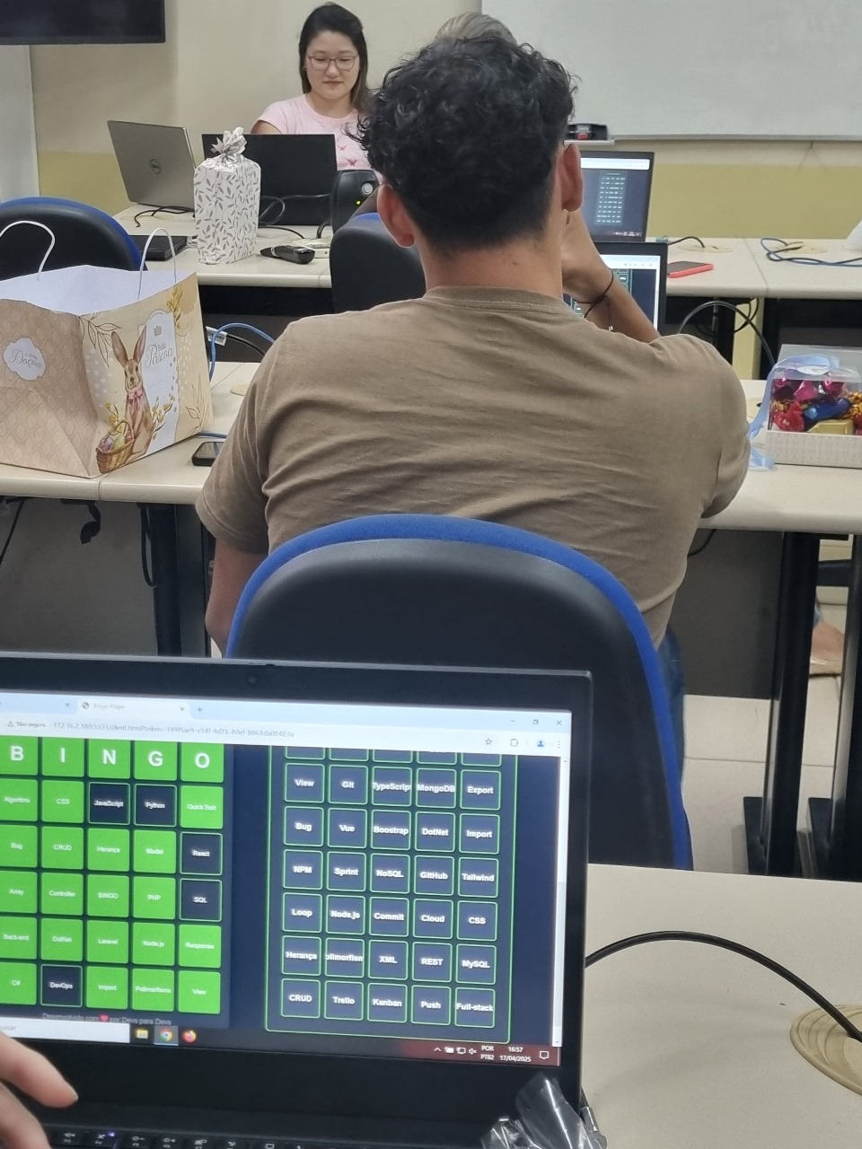 O destaque da tarde foi o bingo digital, uma solução desenvolvida especialmente para o evento pelos alunos Manoela Pinheiro da Silva e João Pedro Garcia Girotto, que utilizaram seus conhecimentos para criar uma versão personalizada do tradicional jogo. Em vez de números, os participantes jogaram com termos da área de Tecnologia da Informação, e a cada item sorteado, a professora responsável conduzia a dinâmica explicando uma definição técnica, desafiando os participantes a identificarem e marcarem corretamente o termo correspondente em suas cartelas digitais.