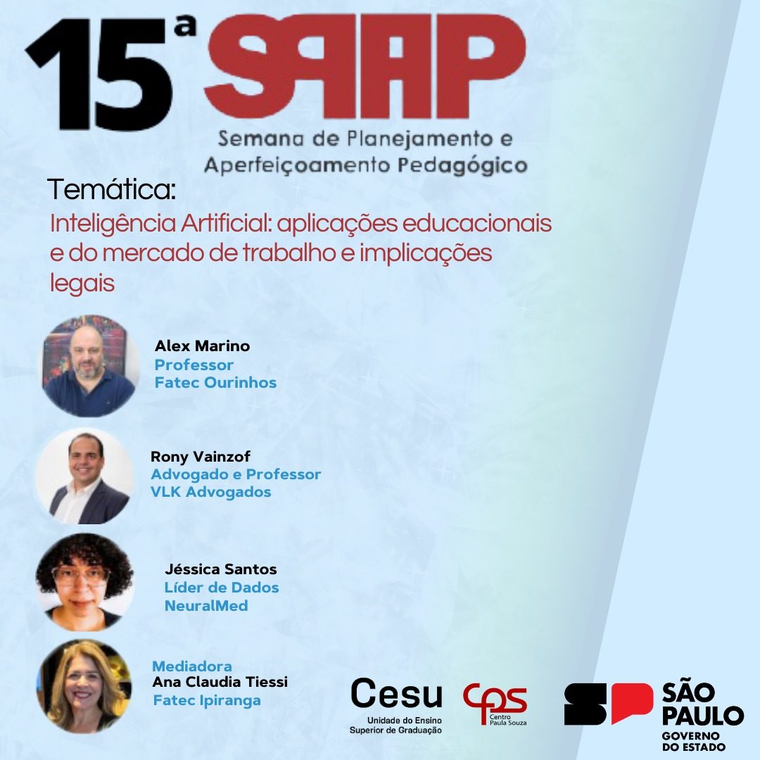 Neste semestre, o evento abordou o tema Inteligência artificial (IA): aplicações educacionais e do mercado de trabalho e implicações legais.