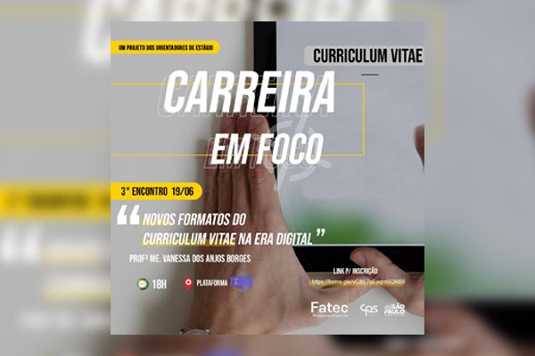 Com a evolução da tecnologia e do mercado de trabalho novas abordagens para recrutamento e seleção são utilizadas pelas empresas. Redes sociais, blogs, sites e vídeos são as novas tendências para que candidatos a vagas de emprego apresentem suas habilidades, capacidades e competências aos empregadores. O projeto “Carreira em Foco” promove um encontro com os alunos da Fatec, ministrado pela prof. Vanessa dos Anjos Borges, intitulado “Novos formatos do Curriculum Vitae na Era Digital”, que procura apresentar e explorar as novas ferramentas para elaboração de Curriculum Vitae.