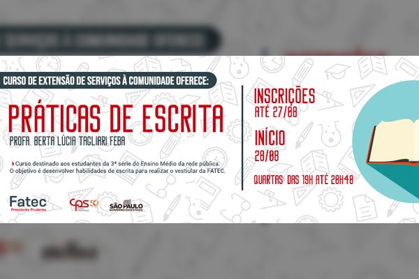 A Faculdade de Tecnologia de Presidente Prudente dará início nesta quarta-feira, dia 28 de agosto, o Curso de Extensão de serviços à comunidade. Trata-se de um curso de extensão sobre “Práticas de Escrita” que visa preparar os cursistas para fazer a redação do vestibular da FATEC. São 40 vagas abertas para a comunidade, direcionadas principalmente para estudantes da 3ª série do Ensino Médio da rede pública de ensino. As aulas acontecerão todas às quartas-feiras, das 19h às 20h40, no Campus da Faculdade, na Rua Teresina, 75, Vila Paulo Roberto.