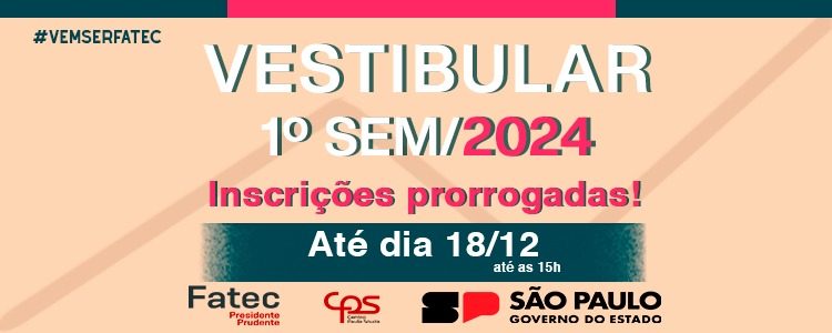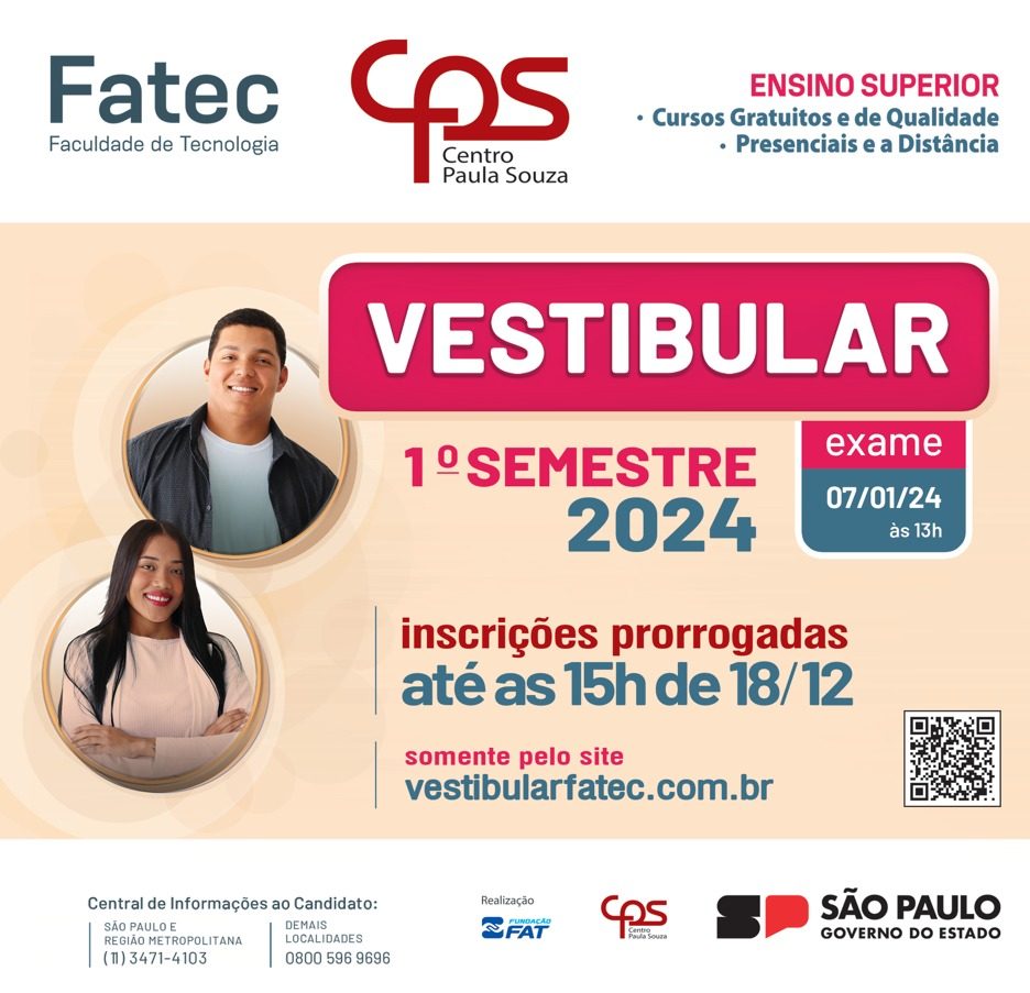 A Fatec prorrogou o período de inscrições do vestibular para o 1º semestre 2024 para até as 15h da próxima segunda-feira (18).