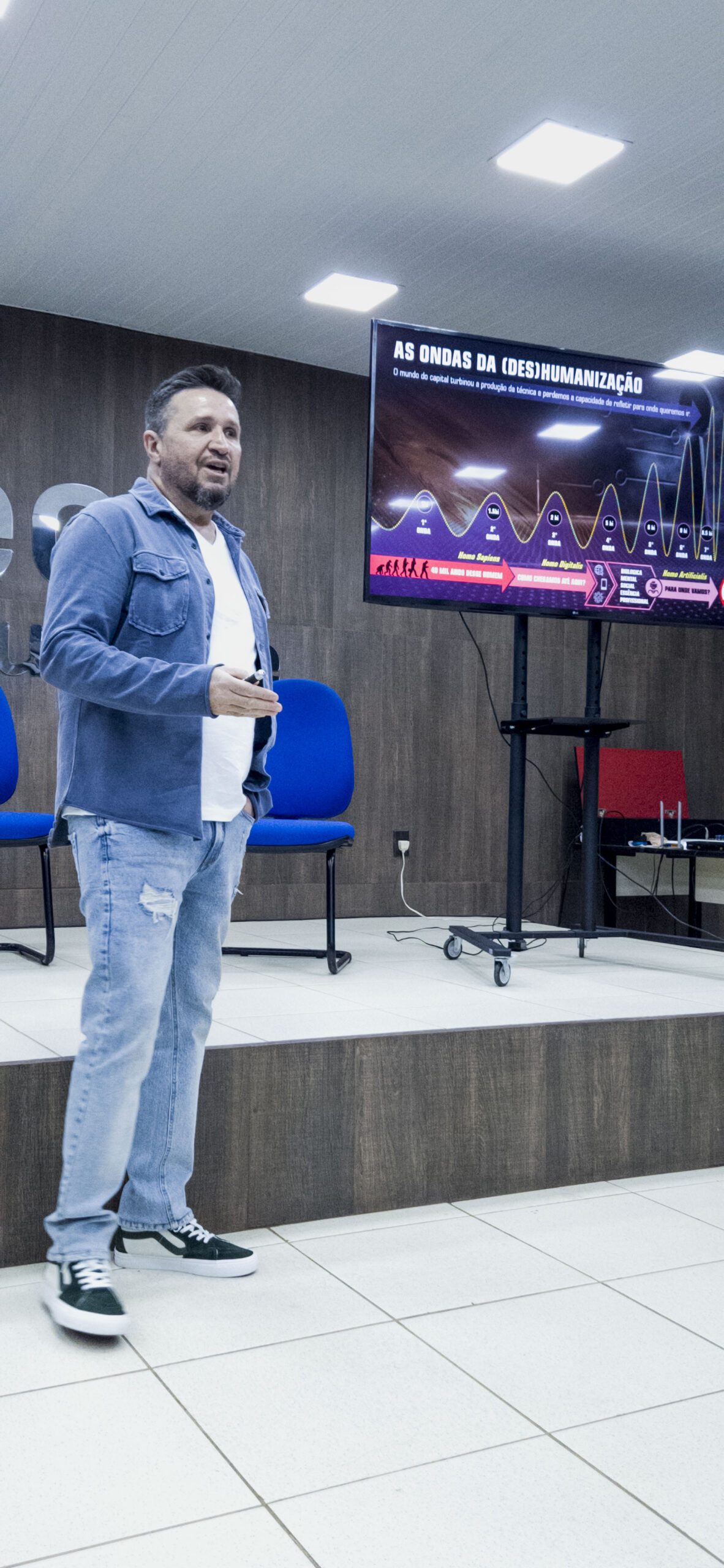 De maneira fascinante e humanizada, o palestrante fez com que a plateia refletisse sobre o conceito de inovação, onde o fator a ser considerado não era a tecnologia ou o sucesso, mas sim o fator humano, demonstrando ao público, que o ato de inovar é muito mais do que apenas desenvolver uma nova tecnologia ou técnica.