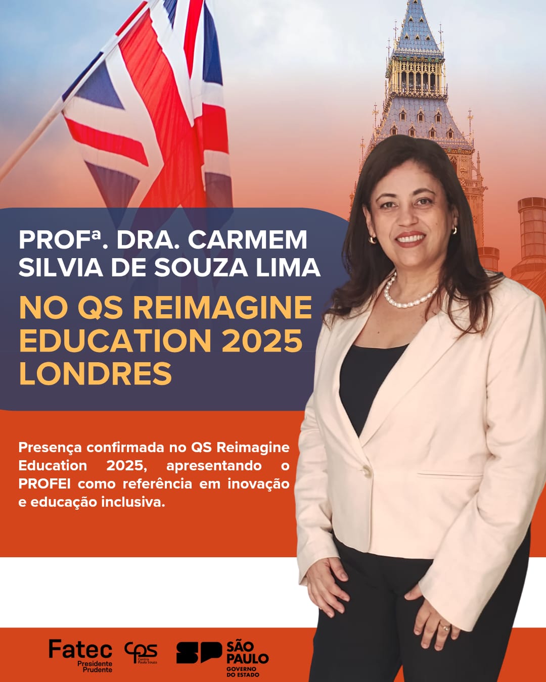 A Fatec Presidente Prudente tem a satisfação de anunciar a participação da Profa. Dra. Carmem Silvia de Souza Lima no QS Reimagine Education 2025, um dos mais relevantes fóruns internacionais dedicados à inovação no ensino superior e às tecnologias educacionais (EdTech). O evento, realizado anualmente pela Quacquarelli Symonds (QS), reúne líderes universitários, pesquisadores, especialistas em tecnologia educacional e gestores de políticas públicas de diversos países.