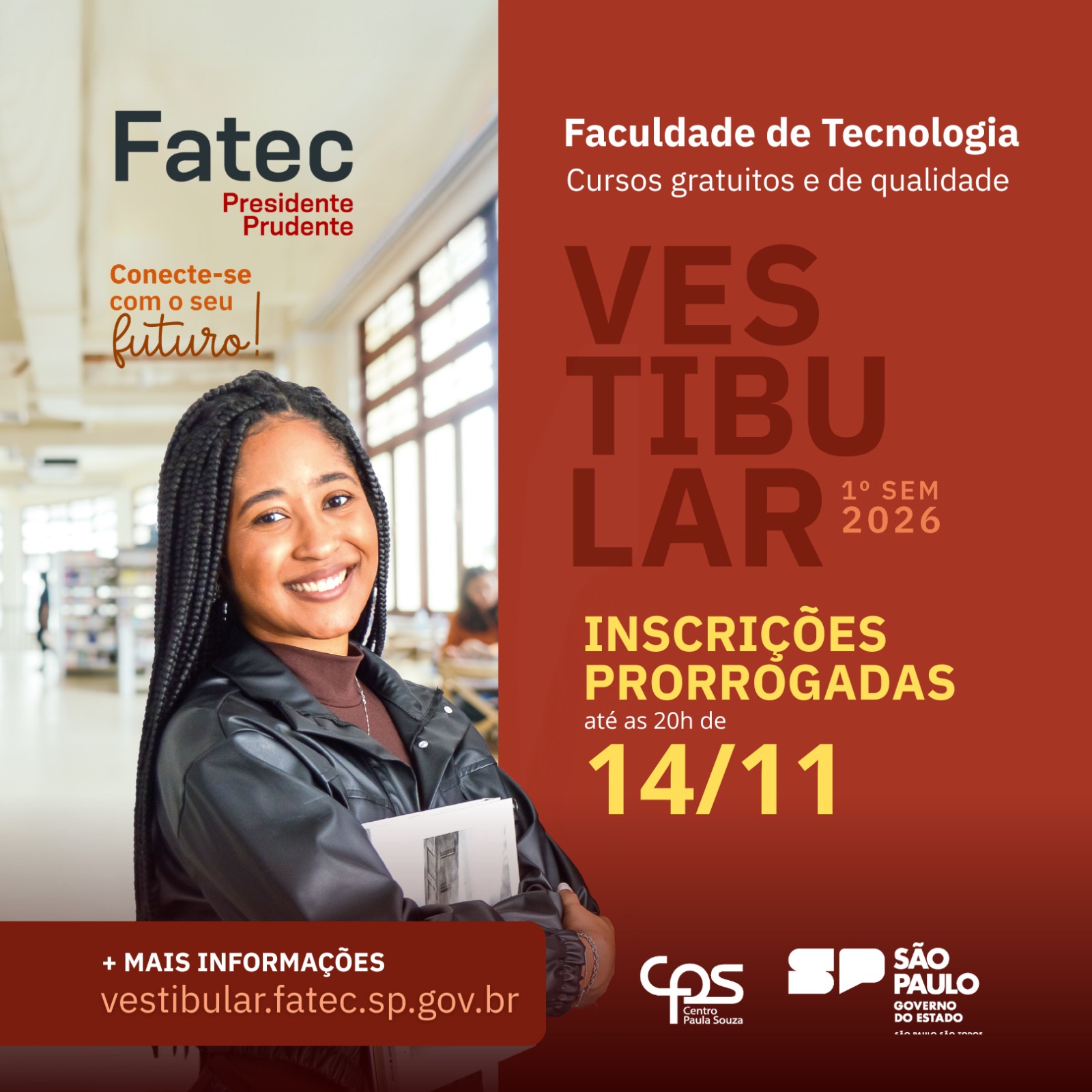 A Faculdade de Tecnologia (Fatec) de Presidente Prudente informa que as inscrições para o Vestibular 1º semestre de 2026 foram prorrogadas até as 20h do dia 14 de novembro!