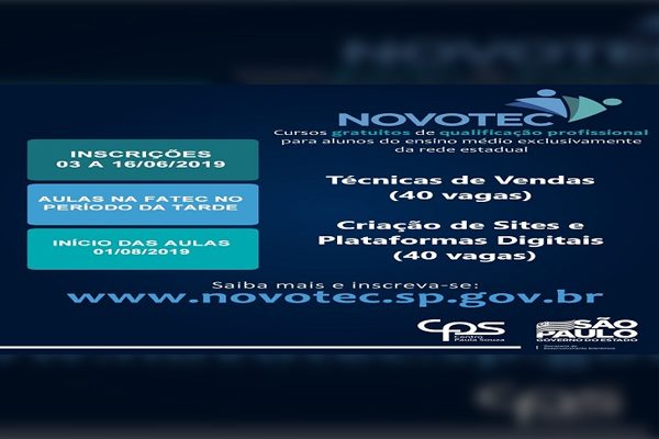 Os interessados nos cursos do Novotec Expresso, já podem fazer suas inscrições. O Sistema de inscrição foi aberto nesta segunda-feira (3), e ficará disponível até o dia 16 de junho. As inscrições são gratuitas e devem ser feitas pelo site www.novotec.sp.gov.br.
