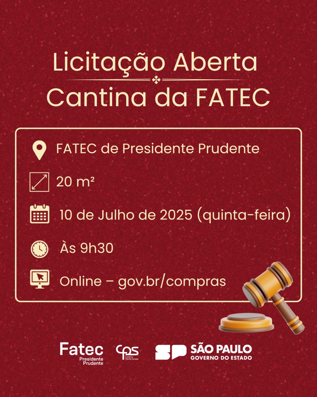 Atenção empreendedores! Está aberta a licitação para uso da cantina escolar da FATEC Presidente Prudente! Uma ótima oportunidade para quem quer empreender no ambiente educacional
