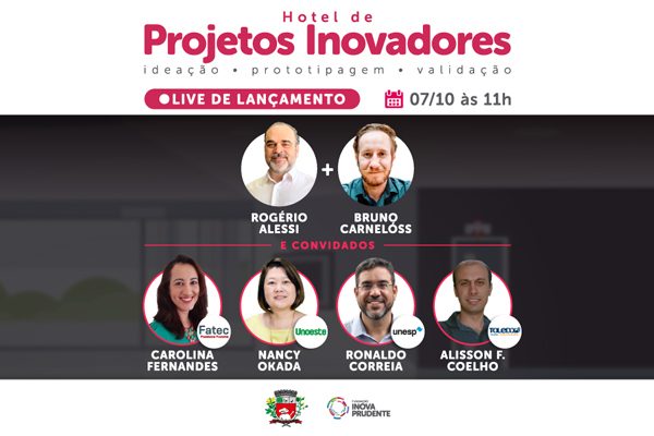 Nesta quarta-feira (07/10), às 11h, o secretário de tecnologia, Rogério Alessi, e o diretor-presidente da Inova Prudente, Bruno Carnelóss, estarão discorrendo detalhes a respeito do Programa Hotel de Projetos Inovadores. O bate-papo será transmitido simultaneamente pelo Canal do YouTube da Fundação.