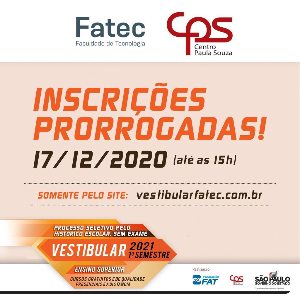Inscrições até as 15h do dia 17/12 pelo site: www.vestibularfatec.com.br