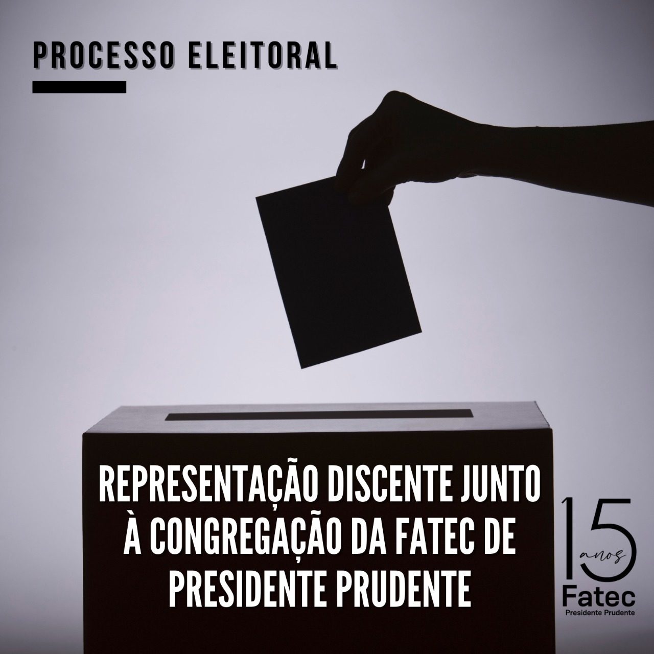 Neste momento será conduzido o processo eleitoral para escolha do representante discente e poderão se inscrever os alunos que se encontram em situação regular, devidamente matriculados, cursando entre o 1° e 4° semestre dos cursos regulares e na modalidade à distância oferecidos na Faculdade de Tecnologia de Presidente Prudente.