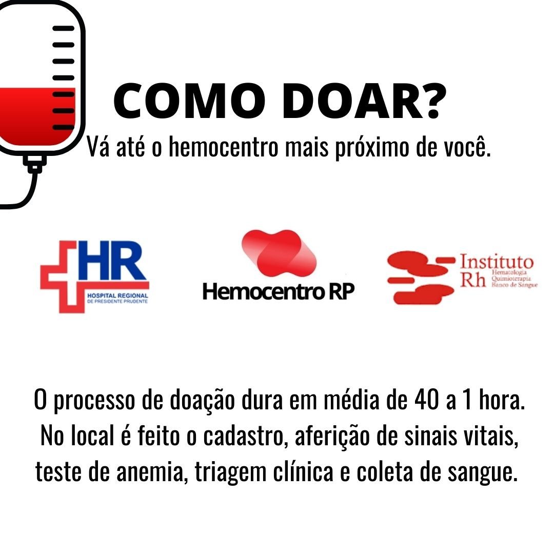Cada pessoa que aceitar fazer uma doação voluntária para um dos bancos de sangue do município irá postar uma foto e marcar o perfil @doevida_prudente ou enviar uma foto do momento da doação para que nossa equipe possa incluir no sorteio de prêmios como forma de agradecimento ao final da campanha no dia 30 de abril de 2021.