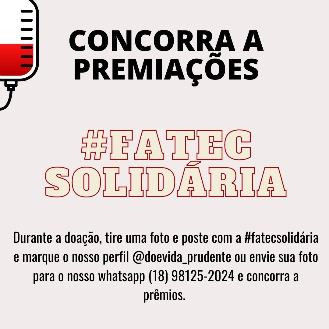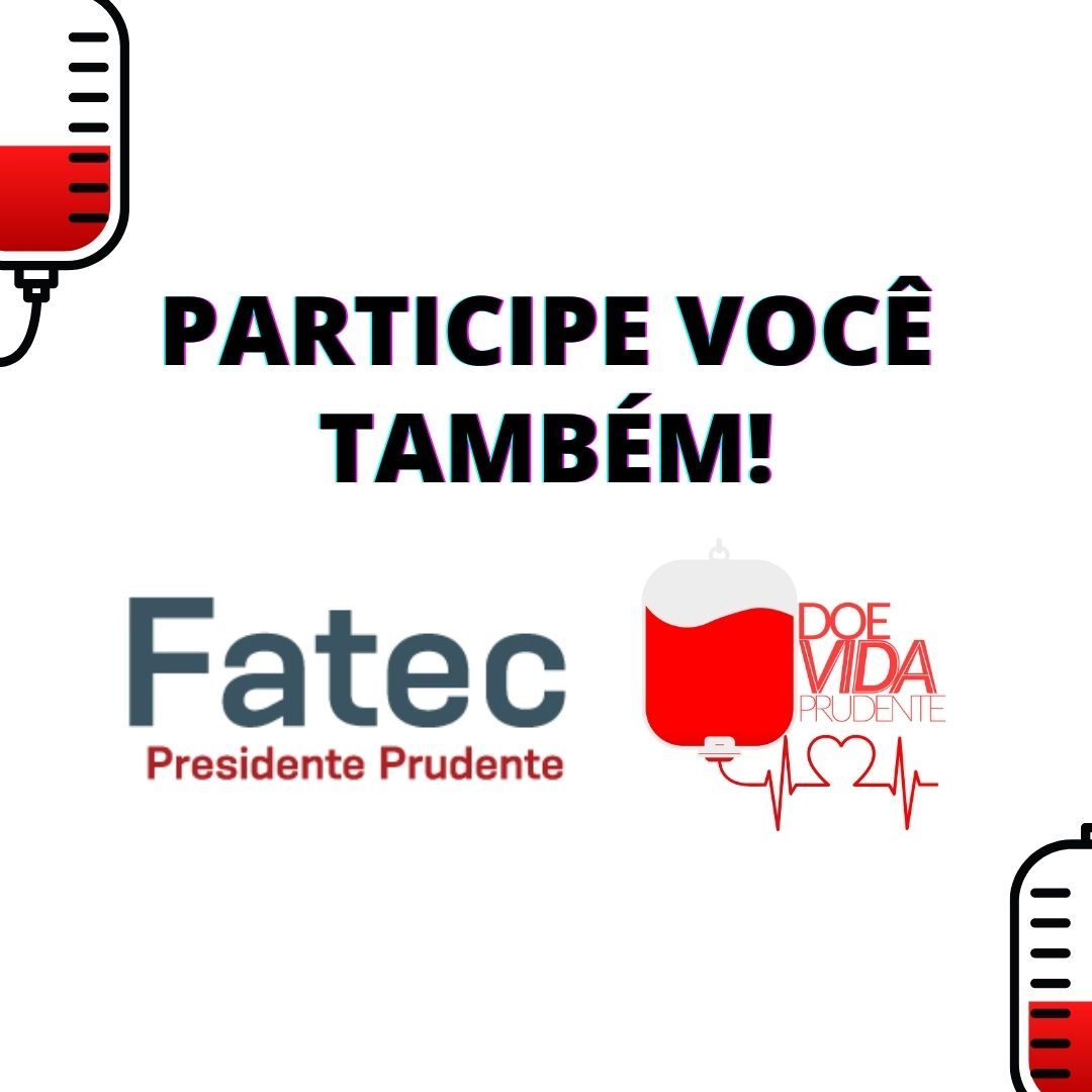 A Faculdade de Tecnologia de Presidente, por meio da disciplina de Projeto Integrador do Curso Superior de Tecnologia em Eventos, está promovendo a partir de 24 de março a ação social “DOE VIDA PRUDENTE”. Trata-se de uma campanha solidária através das redes sociais que tem como objetivo divulgar amplamente através de nossas mídias a necessidade da doação de sangue no município de Presidente Prudente.