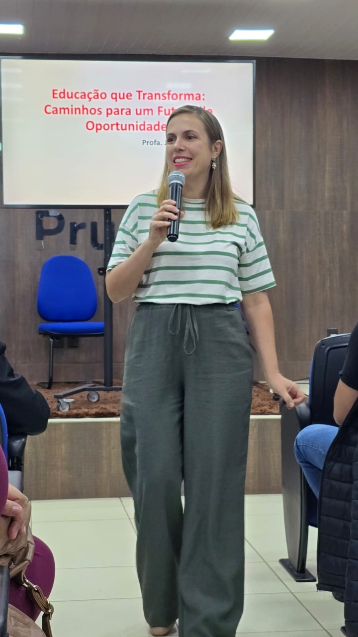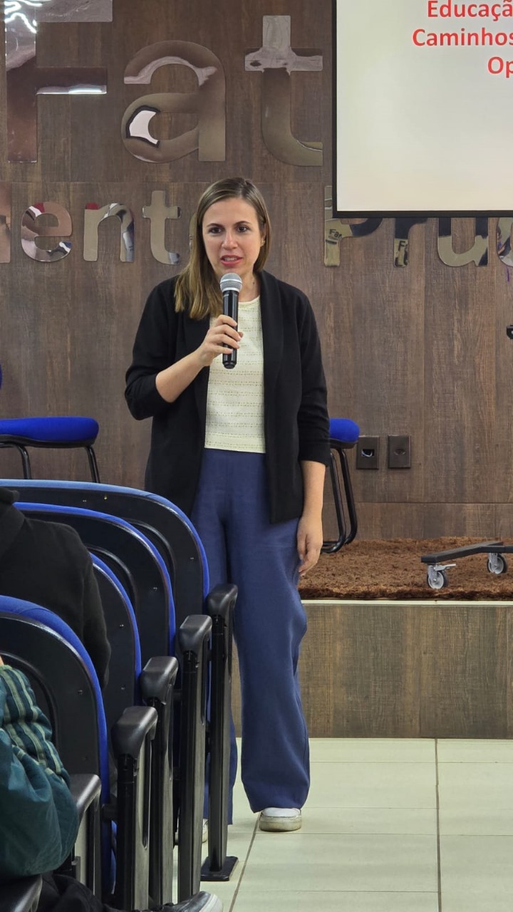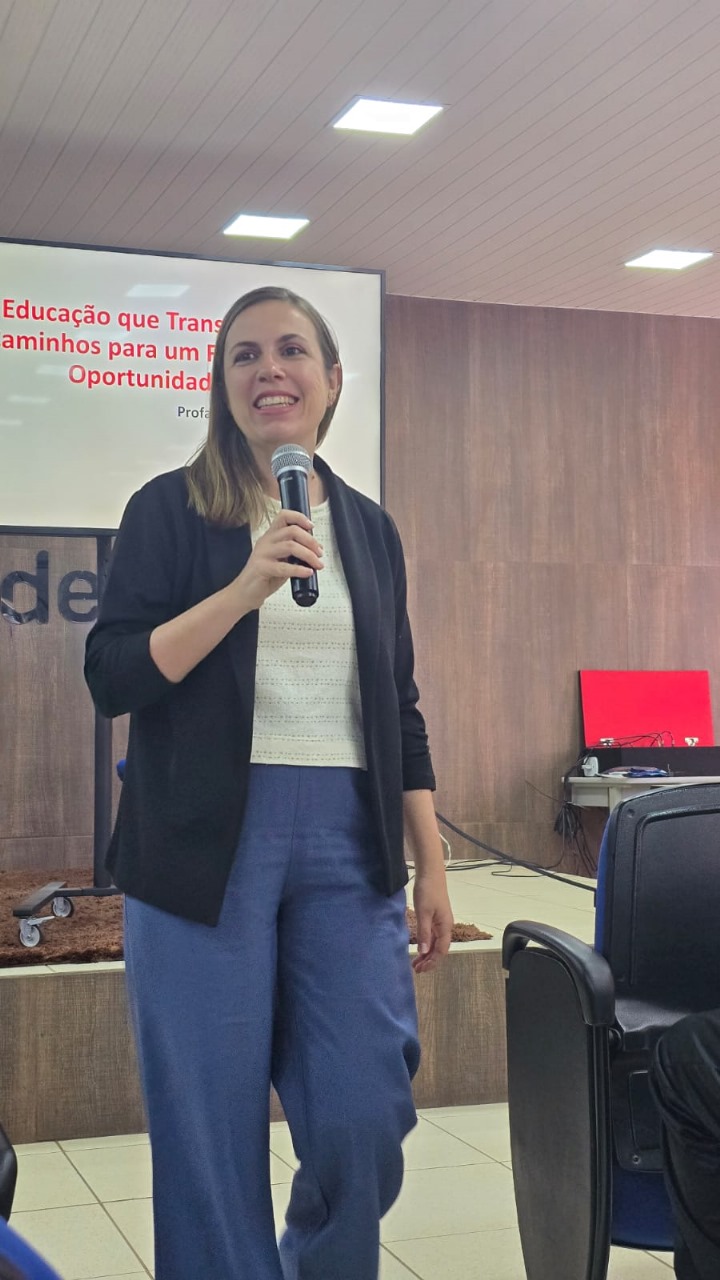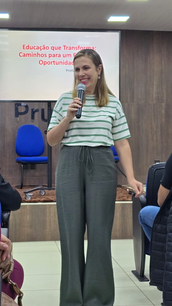 O bate-papon ficou por conta da Profa. Juliana Casarotti Ferreira dos Santos, que realizou uma palestra com o tema “Educação que transforma: Caminhos para um futuro de oportunidade”, inspirando todos os presentes.