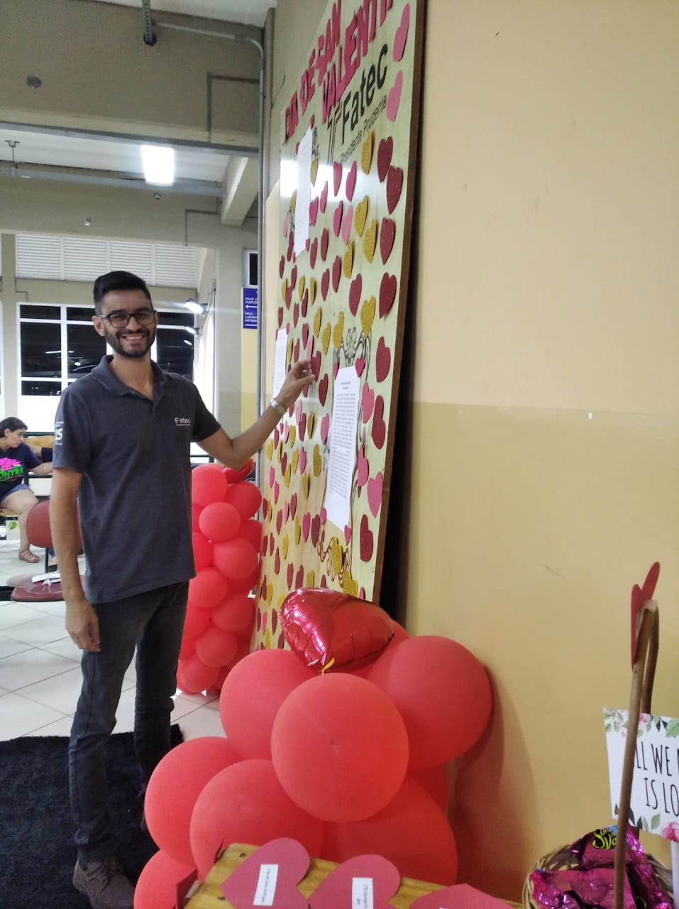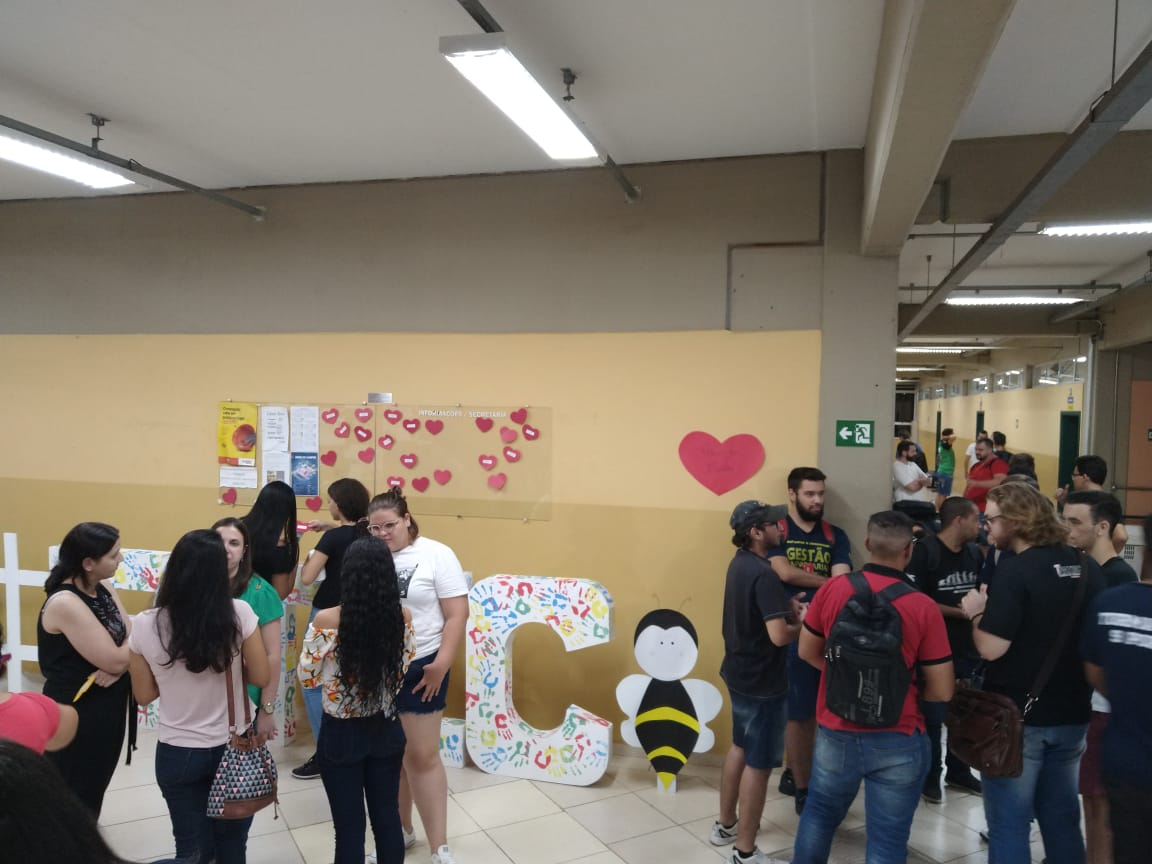 Para entrar no clima e vivenciar as culturas de outros países, os alunos do 6º módulo de Eventos construíram um painel interativo com cartões em formato de coração. Era possível selecionar uma declaração e presentear alguém querido.