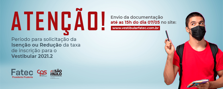Começa hoje (04) o período para solicitação da isenção ou redução da taxa de inscrição do vestibular da Fatec Prudente 2021.2. O prazo se estende até às 15h do dia 07/05.